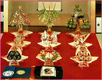 飾り物は、「松・竹・梅・鶴・亀の基本の5点セット」の他、「するめ」・「昆布」・「酒樽」等のめでたい飾り物に加えて、「婚約リング(ダイヤ)」・「ネックレス」・「イヤリング」・「時計」等の装飾品が結納品として届けられます。